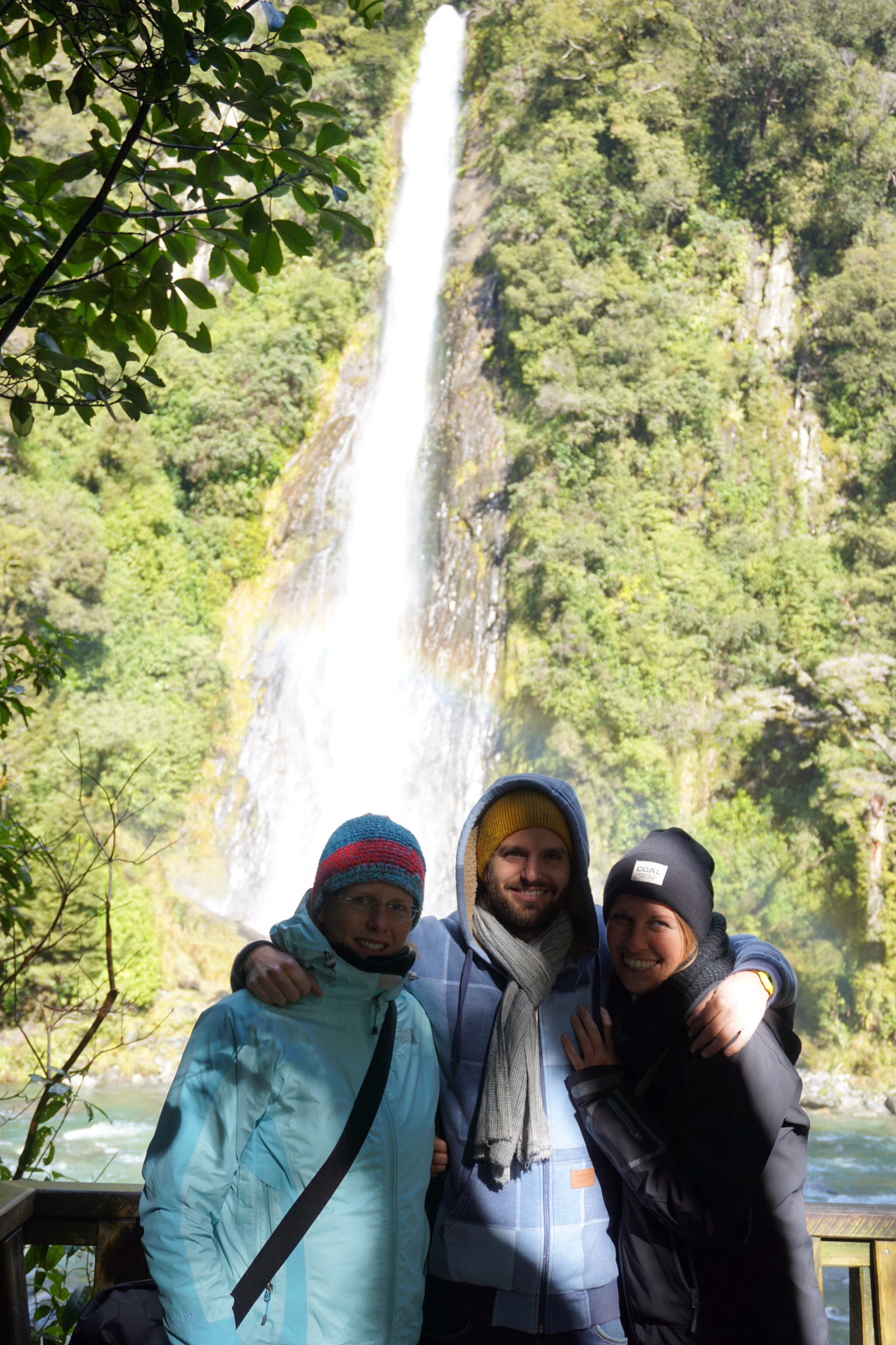 Simone, Stefan und ich am Thunder Creek Waterfall (Mt. Aspiring Nationalpark).
